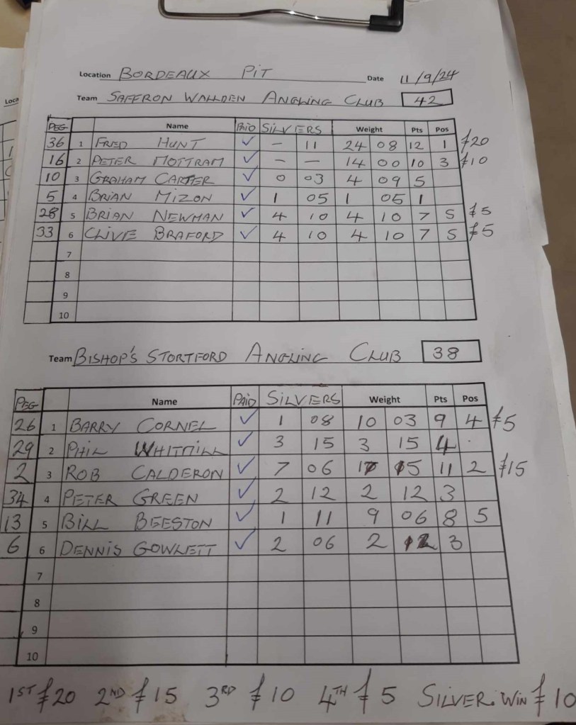 The next Club match is also at Bordeaux, this Sunday [15th September]. As we only have nine booked in, Fred has decided that the match on will only fish half the lake, from the Car Park end. Pegs 10 to 24, around the island will be open to casual anglers.