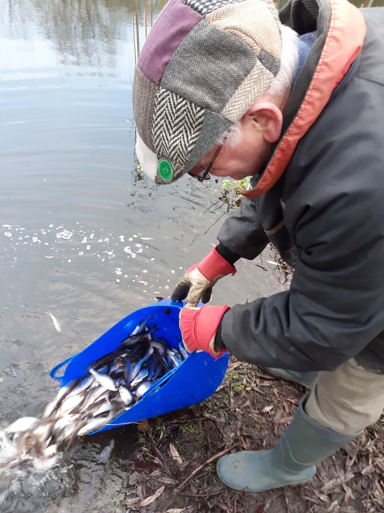 6000 mixed silver fish, nominally 3 – 6 inches; mostly roach, but including some skimmers, perch and the occasional gudgeon were put into the Small Lake. The intention being that these should grow on in the protected environment, where they will receive supplemental feeding, before being transferred into the Main Pit in a year to eighteen months time.