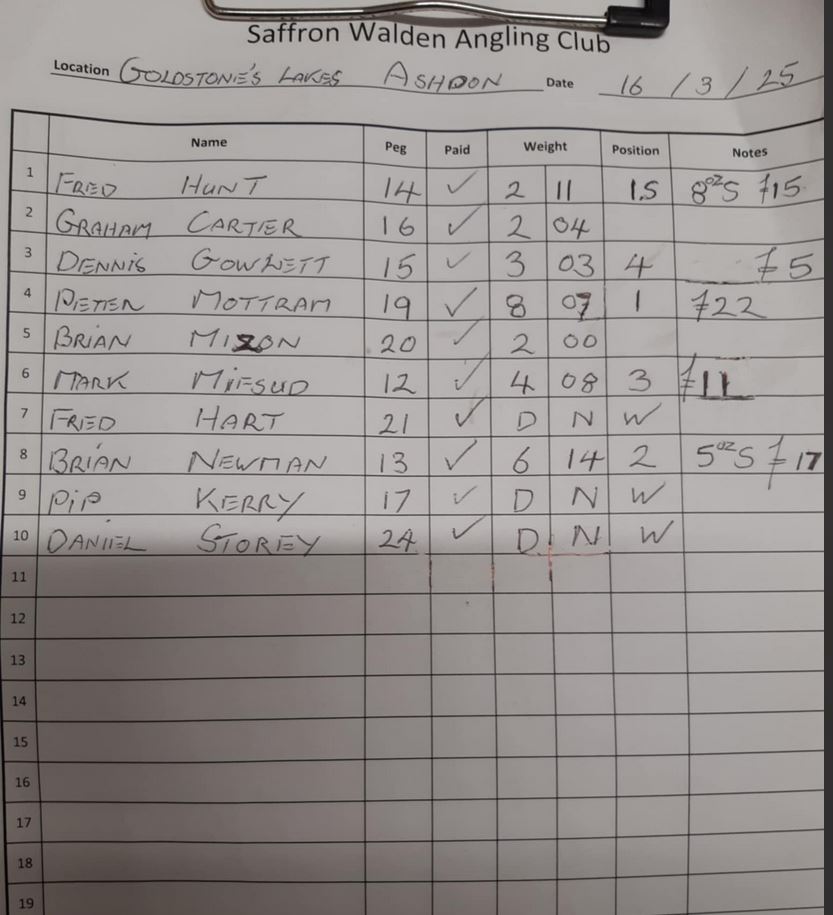 Peter Mottram in peg 19 was the clear winner with his two carp for 8lb 07oz. Brian Newman’s solitary carp was the biggest of the day and earned him second place from peg 13 with 6lb 14oz.