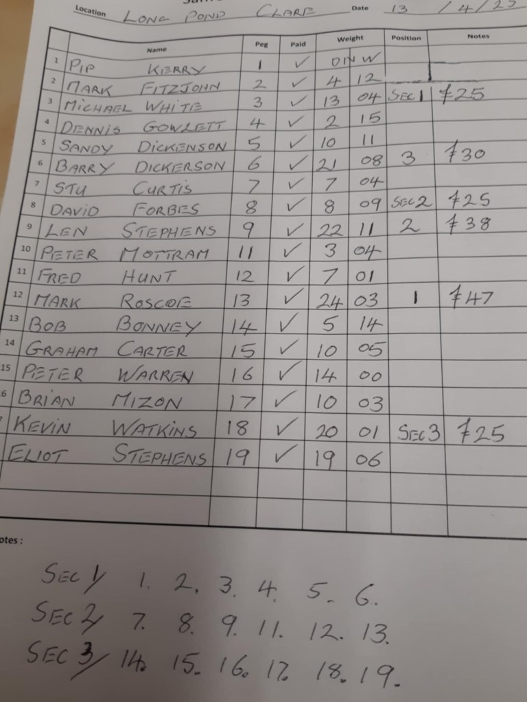 Section 3 [pegs 14 – 19] was won by Kevin Watkins in peg 18 with 20lb 0oz.