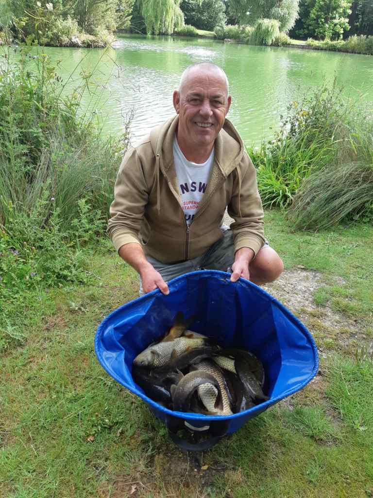 Pip Kerry, along by the island was able to split the ‘framers’ row’ from peg 25 where he was on almost a fish a chuck using the method for his 50lb 05oz. He travelled light today, not even bothering with a brolly, and it clearly paid off. Dennis Gowlett completed the frame with 42lb 15oz from peg 17, again taking advantage of some of the bigger fish.