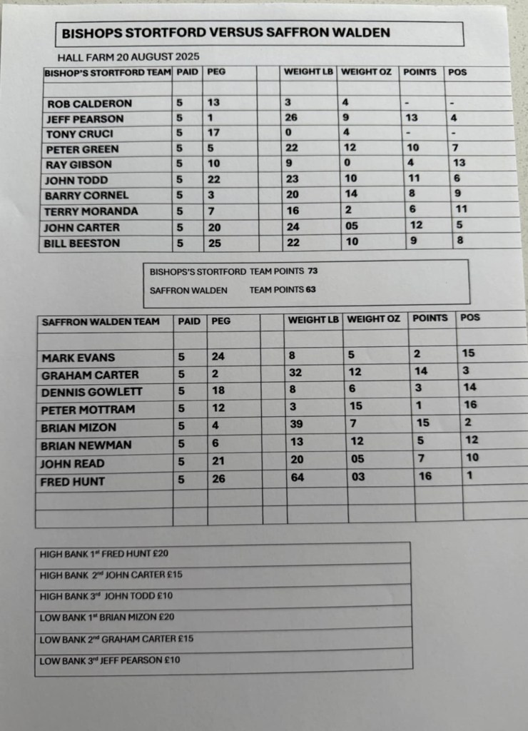 The story of the day though has to be that of Fred Hunt, who like some latter-day Lazarus, rose up from his sick bed [in Addenbrookes] to come out as clear winner on the day with some cracking fish for a bumper 64lb 03oz.