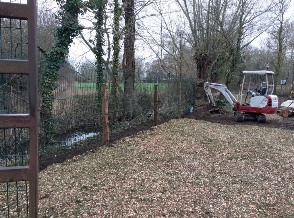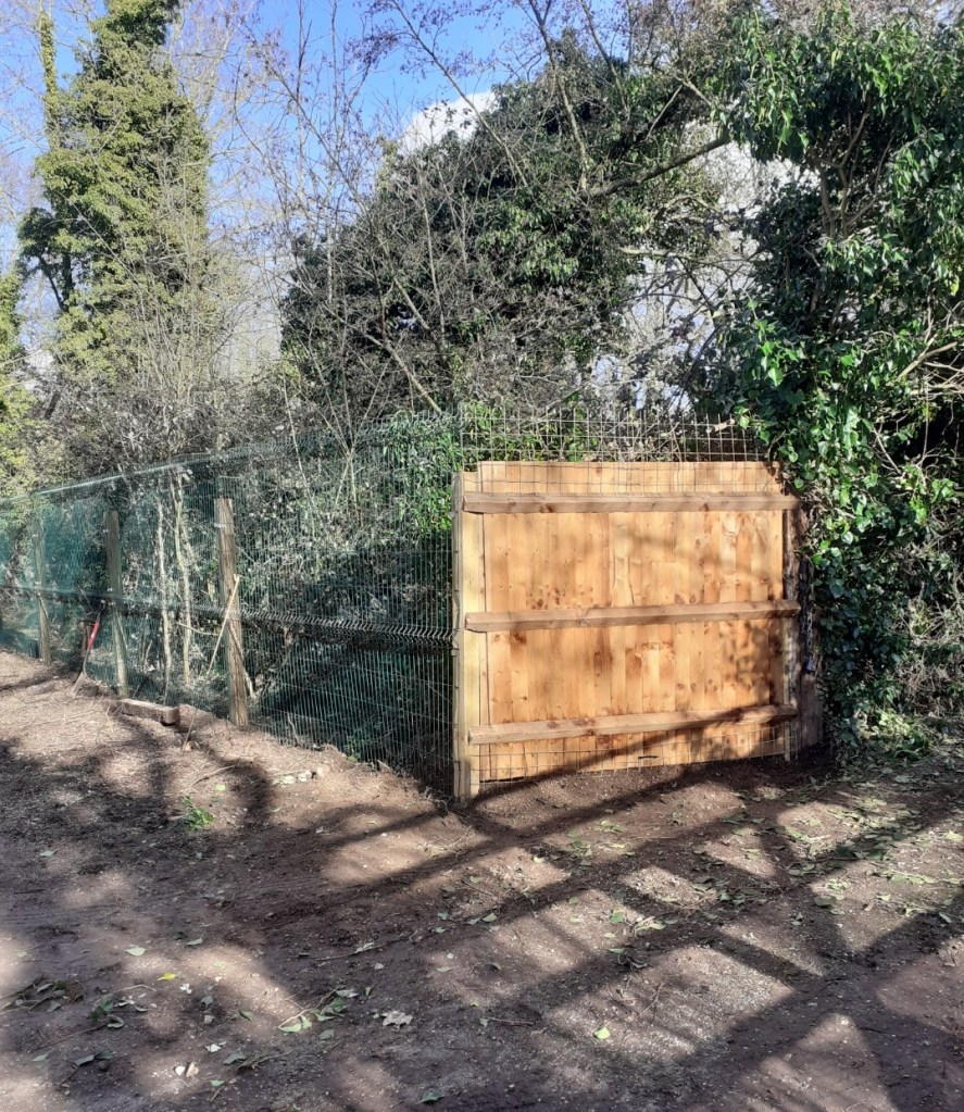 A new wooden fence panel is now in place from the left of gate and the posh green mesh fencing is being dug in and extended along the boundary ditch to the left of the lake. This required the removal of two massive concrete slabs that had been buried for may years and were well and truly rooted in place. They now form an ‘interesting feature’ in he lake, to the right of the old ‘Handys’ peg.