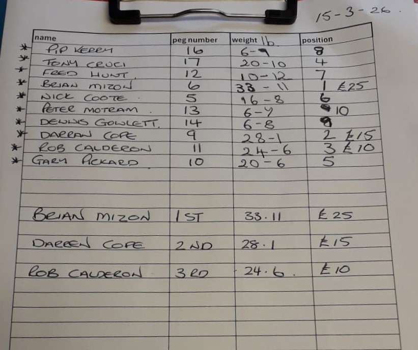 Brian Mizon had a good finish on peg 6 to net 33lb 11oz – he didn’t start catching until 1pm! Darren Cope was second with 28lb 01oz on peg 9, with a net that included approx 5lb of silvers. The frame was completed by Rob Calderon on peg 11 with 24lb 06oz.