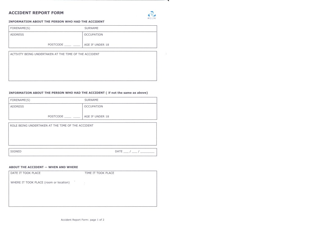 ⦁ All injuries other than minor cuts and abrasions should be recorded on ‘accident forms’. It is a requirement that both the injured party (if feasible) and the responsible person sign the form. If the circumstances of the accident are not clear – notes of the accident must be made on the form.